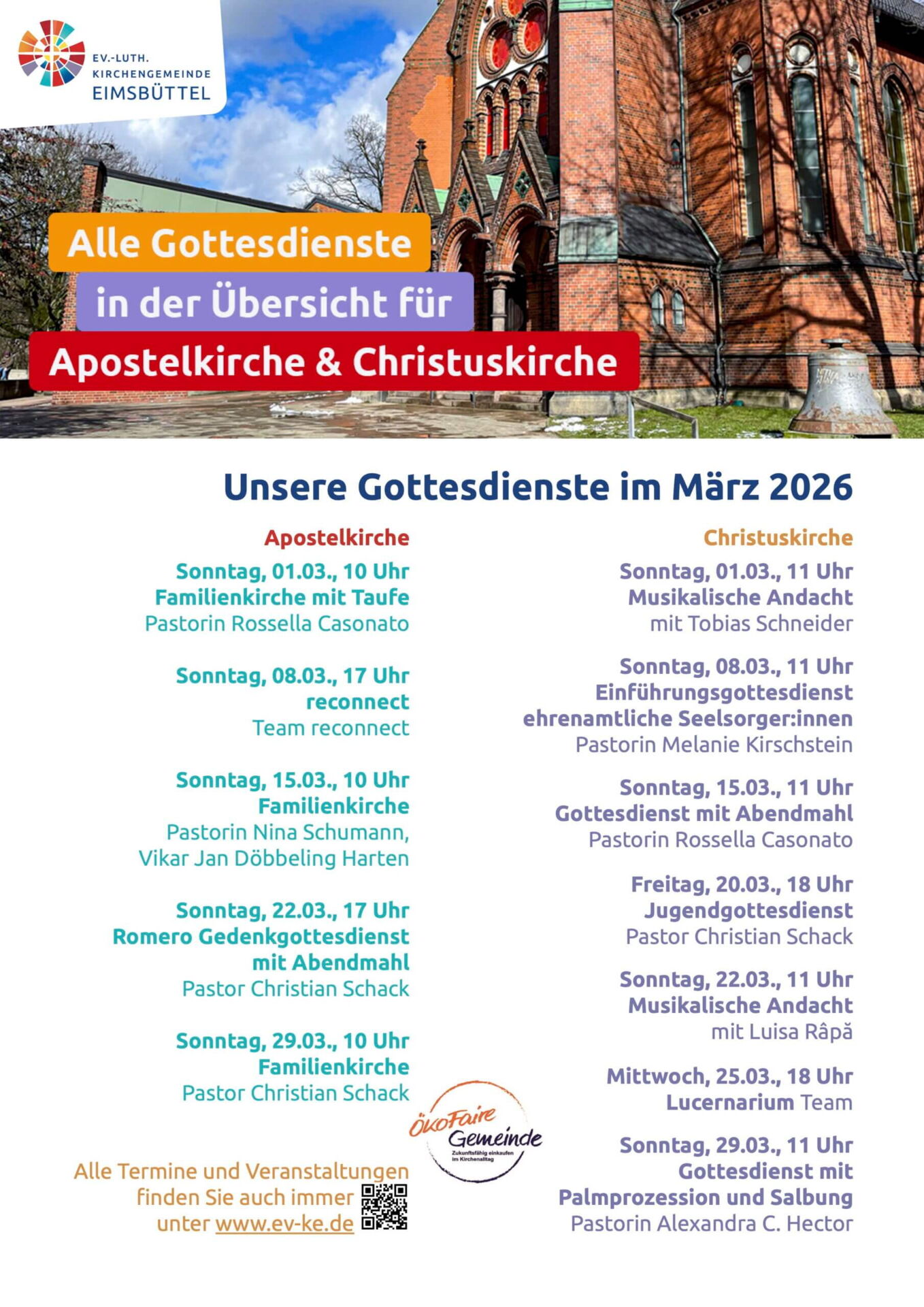 Auf Wunsch einiger Gemeindemitglieder stellen wir hier das aktuelle Übersichtsplakat der Gottesdienste online zur Verfügung. Ihr findet es auch immer in unseren Schaukästen an den Kirchen. Für detaillierte Informationen zum jeweiligen Gottesdienst informiere Dich bitte in der Auflistung weiter unten auf dieser Seite oder in unserem Webkalender.